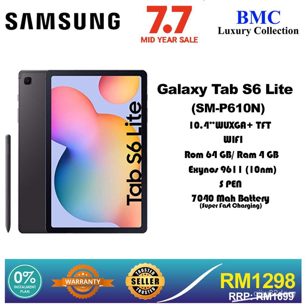 The Samsung Galaxy Tab S6 Lite WiFi SM -P610 is an Android Tablet . It has 10 .4 inches, (WUXGA) 2000 x 1200 pixels screen resolution . And it is powered by Exynos 9611 CPU, and Mali-G72 MP3 GPU . It runs Android 10 .0 . This Samsung tablet gives the user 4GB of RAM . Where the Android Operating System is running, In addition to the user applications . . .