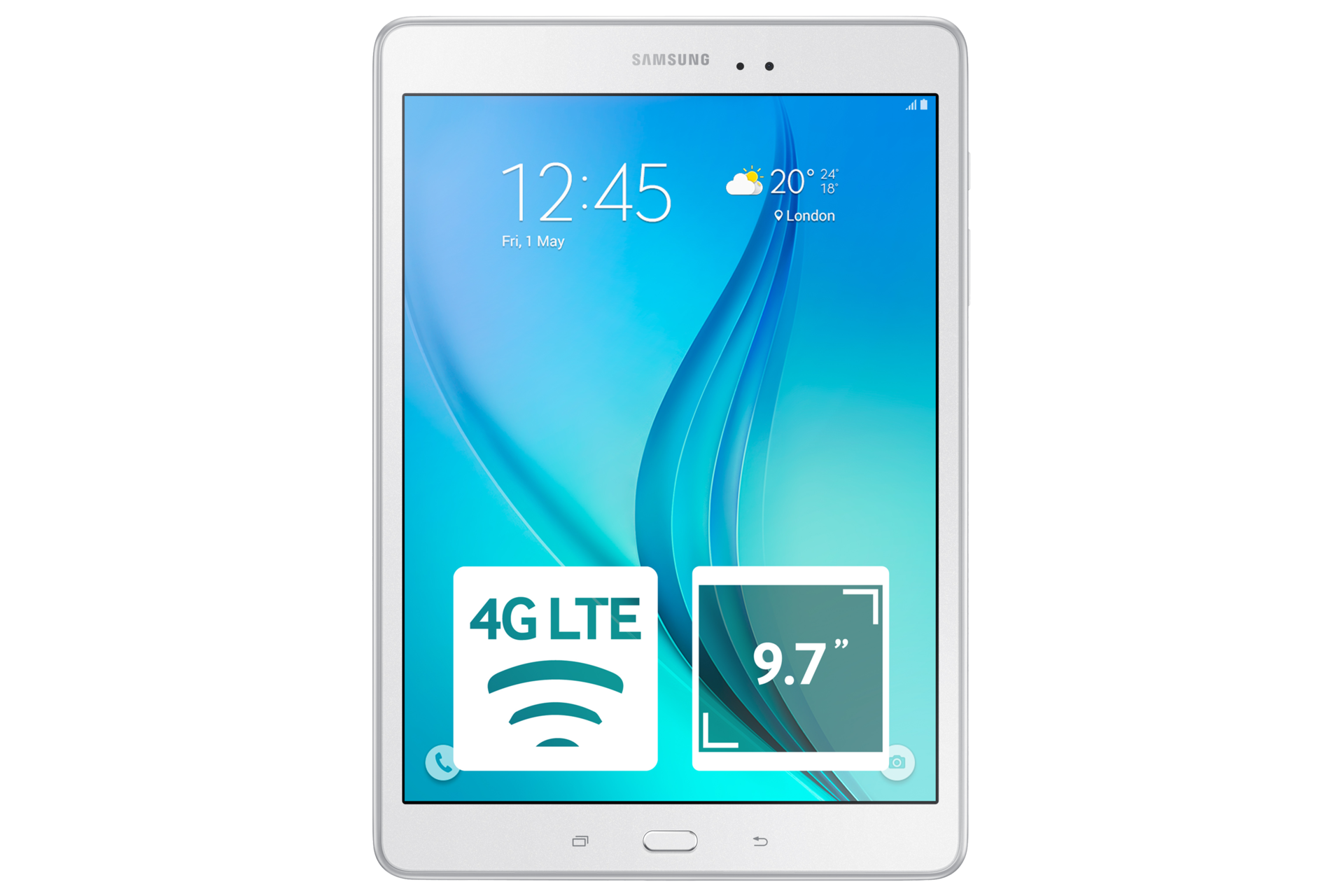 Samsung Galaxy Tab A 9 .7 Android tablet . Announced Mar 2015 . Features 9 .7 ″ display, 5 MP primary camera, 2 MP front camera, 6000 mAh battery, 32 GB storage, 2 GB RAM .
