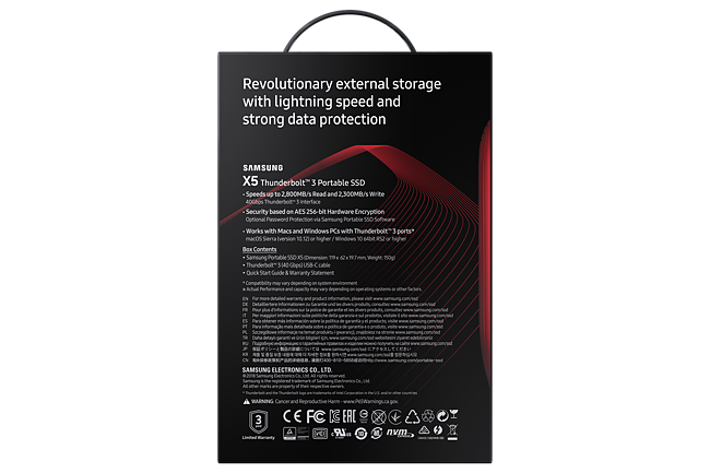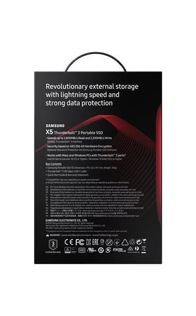 Samsung Portable SSD X5 Professionalism at its finest . Elevate your storage tasks to ultimate heights on PCs and Macs with Thunderbolt ™ 3 ports* . The X5 is designed for tech savvy professionals who want to render or compile high resolution contents faster than ever . Its thermal management and password protection offer both comfort and security .