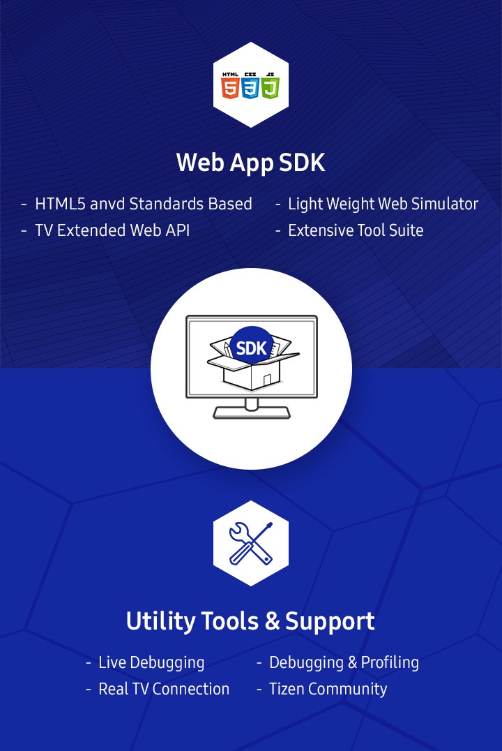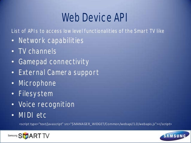 Samsung Product API References . The Samsung Product API enables you to access features specific to Samsung TVs , to extend the capabilities of your application beyond those provided by the Tizen Web Device API . W3C/HTML5 API References . Samsung TVs support various W3C and HTML5 features . You can use graphics, media, and storage features, as well . . .