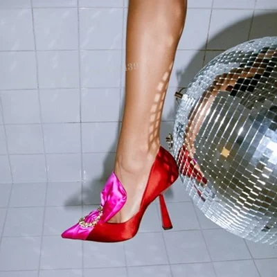 Sandals Red Silk Crystal Buckle Woman Elegant Stiletto Bling Riband Rhinestone Cover Heels Pointed Toe Ruffle Design Dress Shoes - Купить с бесплатной доставкой
