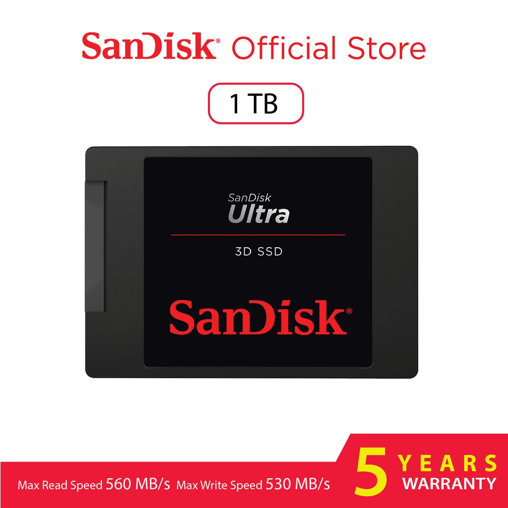 Sandisk SSD 1TB Sandisk Ultra 3D [SDSSDH3-1T00-G25] Sandisk Ultra 3D . Solid-state drive capacity 1000 GB . SSD form factor 2 .5 . Solid-state drive interface Serial ATA III, Read speed 560 MB/s, Write speed 530 MB/s, Data transfer rate 6 Gbit/s, Component for PCPerformanceSSD capacity1000 GBSSD . Bpm power .