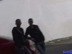 Zwei Typen fickt das Luder am Pool