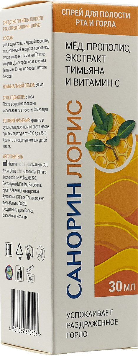 Описание Спрей САНОРИН ЛОРИС - средство гигиены и полости рта, содержащее мед, прополис, экстракт тимьяна и витамин С, которые традиционно используются при воспалительных процессах рта и горла .