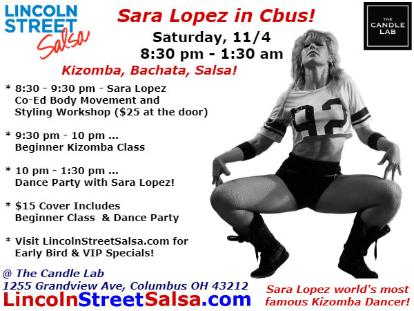 Sara López es una bailarina reconocida a nivel internacional. Ella ha roto fronteras en la futura evolución de la Kizomba con su personal estilo moderno, funky y sensual. Fue subcampeona en el Concurso Internacional de Kizomba AfricaDancar en 2010 y no ha parado desde entonces.