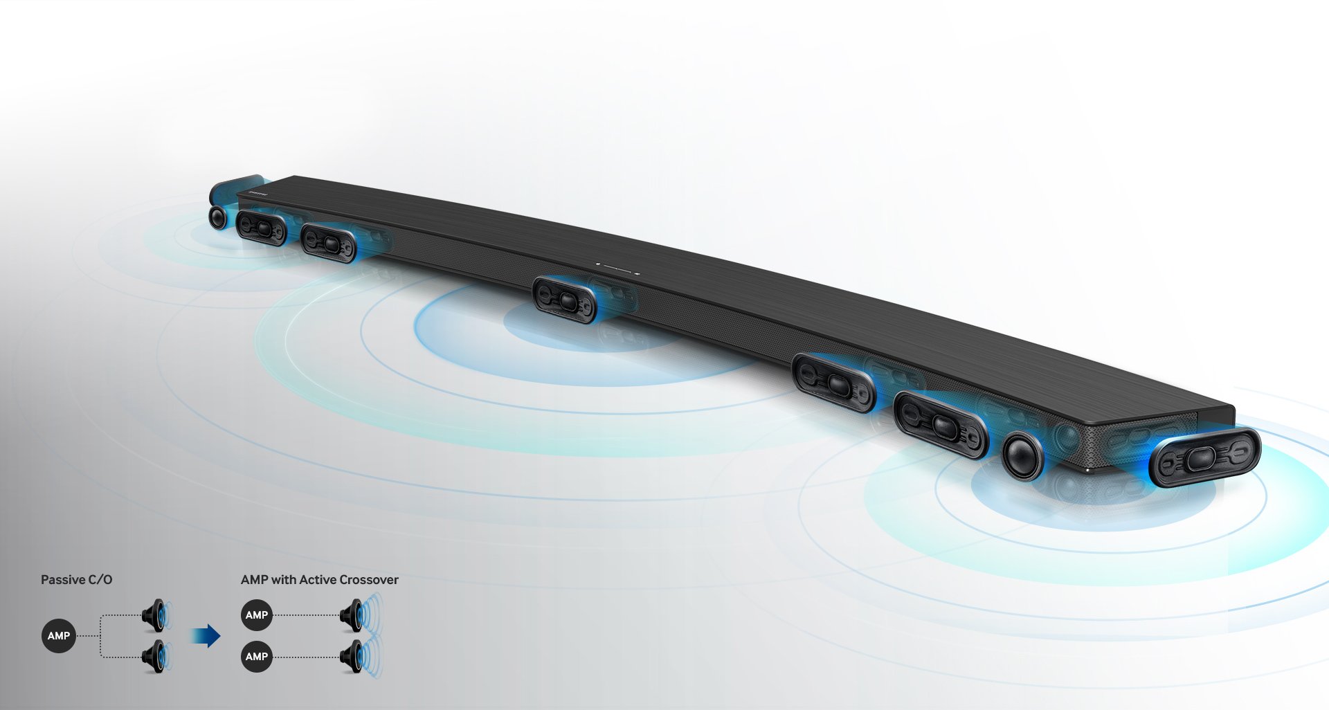 HW-J8500R CURVED SOUNDBAR SPEC SHEET KEY FEATURES CURVED DESIGN Enhance the look and sound of your TV with the sleek design of the Curved Soundbar . The distinctive curved design blends seamlessly with your curved Samsung TV . 5 .1 CHANNEL SPEAKER SYSTEM Immerse yourself in our richest, fullest home audio experience . Enjoy