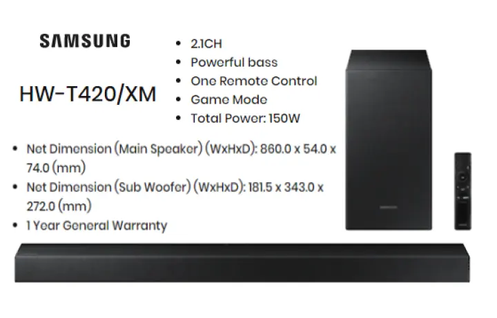 Samsung Soundbar T420 with the 2 .1ch and 6 .5 inch subwoofer . Feel the intensity of the powerful, deeper bass . Elevate your sound experience with T420 .