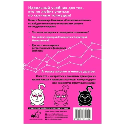 Vladimir Savelyev'in "İstatistikler ve Kediler" kitabı istatistik okumak isteyen ancak sıkıcı Talmudlardan hoşlanmayan herkes için ideal bir ders kitabıdır. Yazar, bu kitapta kedilerin hayatından pek çok büyüleyici ve ilginç örnek sunuyor ve bunlara dayanarak istatistiğin temel kavramlarını açıklıyor. Kitap 192 sayfadan oluşuyor ve ciltli. Rusça yazılmış ve 2021 yılında yayınlanmıştır. Savelyev Vladimir, uzun yıllardır istatistiğin bilimi ve popülerleştirilmesiyle ilgilenen ünlü bir yazardır. "İstatistikler ve Kediler" kitabı okuyuculardan pek çok olumlu eleştiri aldı. "İstatistikler ve Kediler" kitabının avantajları:1. Kedilere ve istatistiklere dayanan büyüleyici bir hikaye.2. İstatistiğin temel kavramlarının basit ve anlaşılır anlatımı.3. Materyali daha iyi anlamanıza yardımcı olacak birçok gerçek hayattan örnek.4. Kitabın okunmasını ve kullanılmasını kolaylaştıran ciltli ve yüksek kaliteli baskı.5. Herkesin kitabı satın almasına ve istatistikleri incelemesine olanak tanıyan uygun fiyat “İstatistikler ve Kediler” kitabı nasıl kullanılır: Size uygun bir hızda okuyun, materyali inceleyin ve sürecin tadını çıkarın 1: “Farklılık ve Kediler”. standart sapma?” Blok 2: “Student t testi ve Mann-Whitney U testi nasıl bulunur?” Blok 3: “Regresyon ve faktör analizleri ne için kullanılır?” Blok 4: “Ve çok, çok daha fazlası!” “İstatistikler ve Kediler” kitabında tüm bu soruların yanıtlarını ve istatistikler ve kedilerle ilgili diğer birçok ilginç gerçeği bulacaksınız.