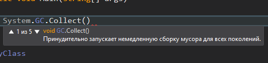 Также, вызов сборщика мусора можно инициировать в программе, вызвав статический метод Collect класса GC, который находиться в пространстве имен System.
