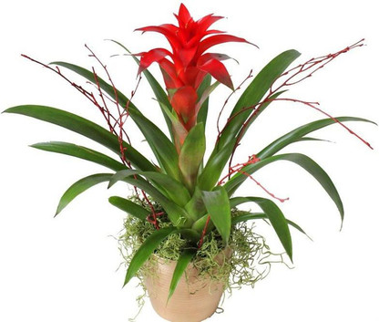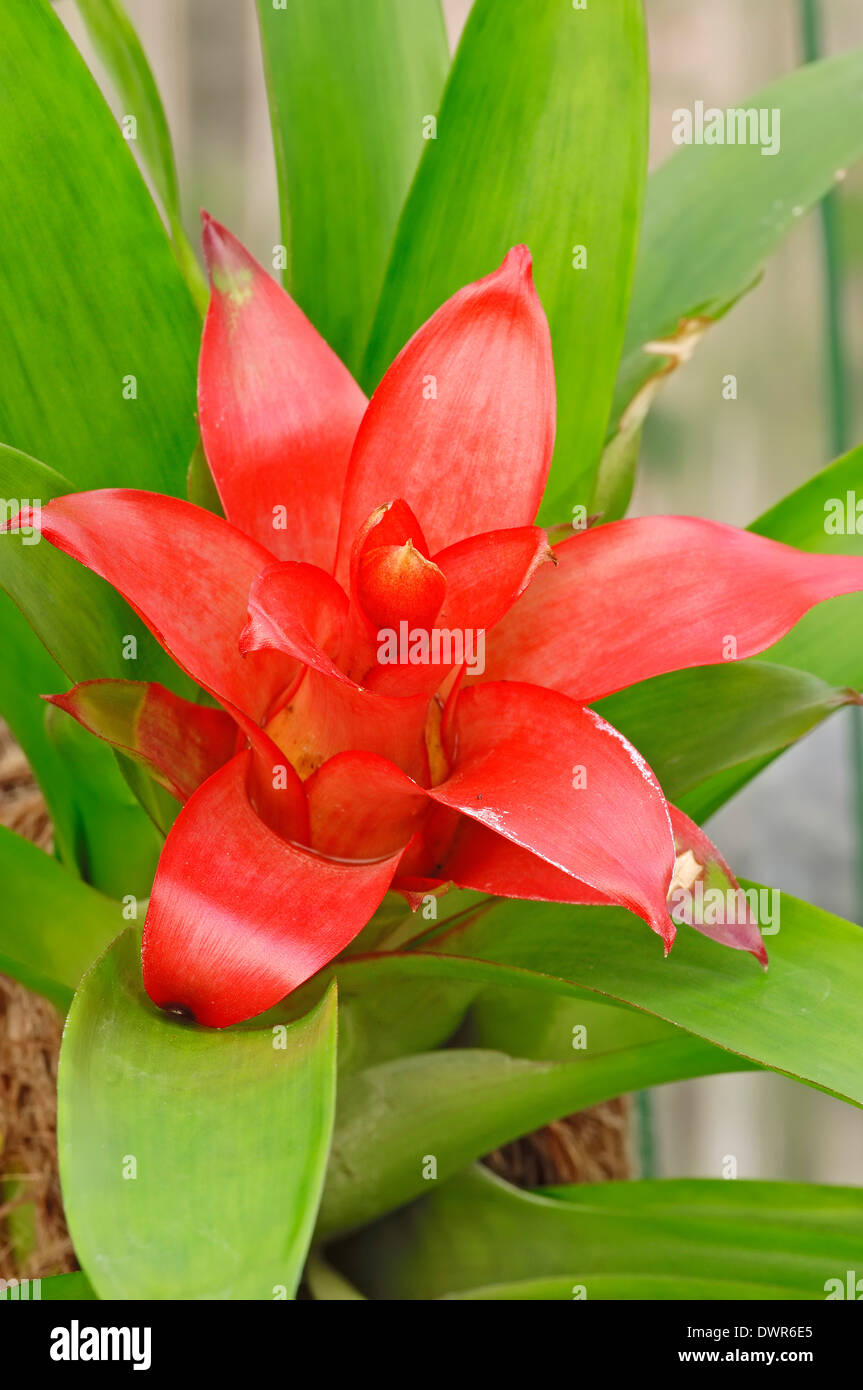 Scarlet Star (Guzmania lingulata) is one of the most popular variety of the bromeliad plants . They feature long, narrow, shiny green leaves that rise from a rosette producing colorful bracts . Some of the best qualities of this plant are its longevity and the ability to propagate the offsets .