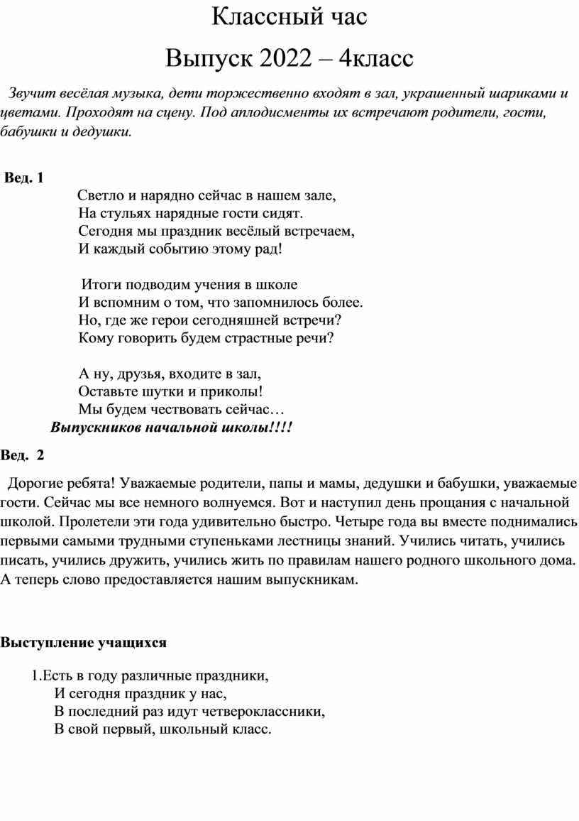 Сценарий выпускного в школе 4 класс
