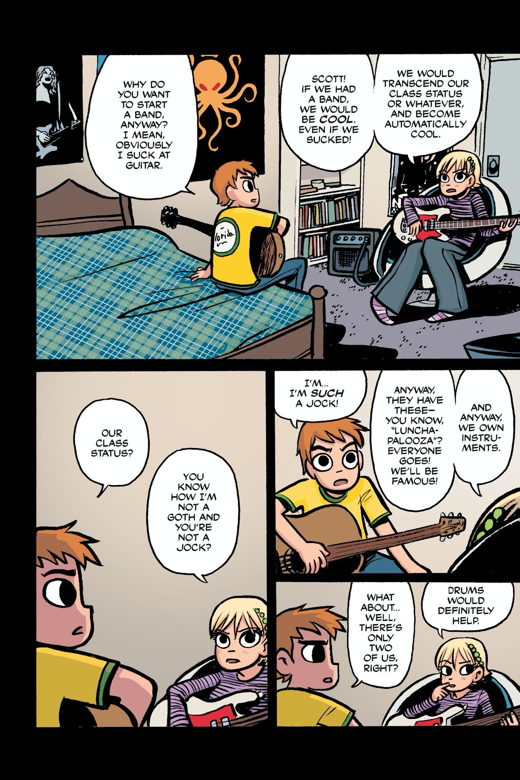 Якесь заняття у Скотта все ж є — він грає у рок-гурті (як він сам вважає, доволі жахливо). Також він має намір одержати перемогу над сімома злими колишніми Рамони Флауерс, дівчини, що нещодавно переїхала до міста. Вона переслідує його у снах та дарує мотивацію робити хоч щось, і Скотт бажає буквально перемогти цих колишніх. Пройти їх, ніби боссів: з левел-апами та трофеями у вигляді монеток, предметів або бонусних життів.