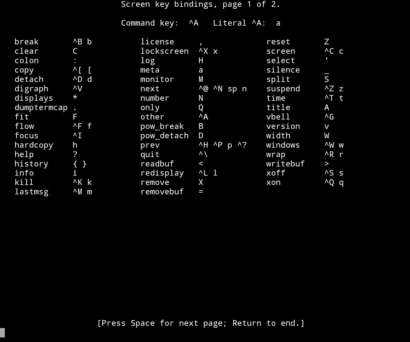 Команда screen обладает большим набором горячих клавиш. Полный их список можно посмотреть с помощью Ctrl + a и ?.