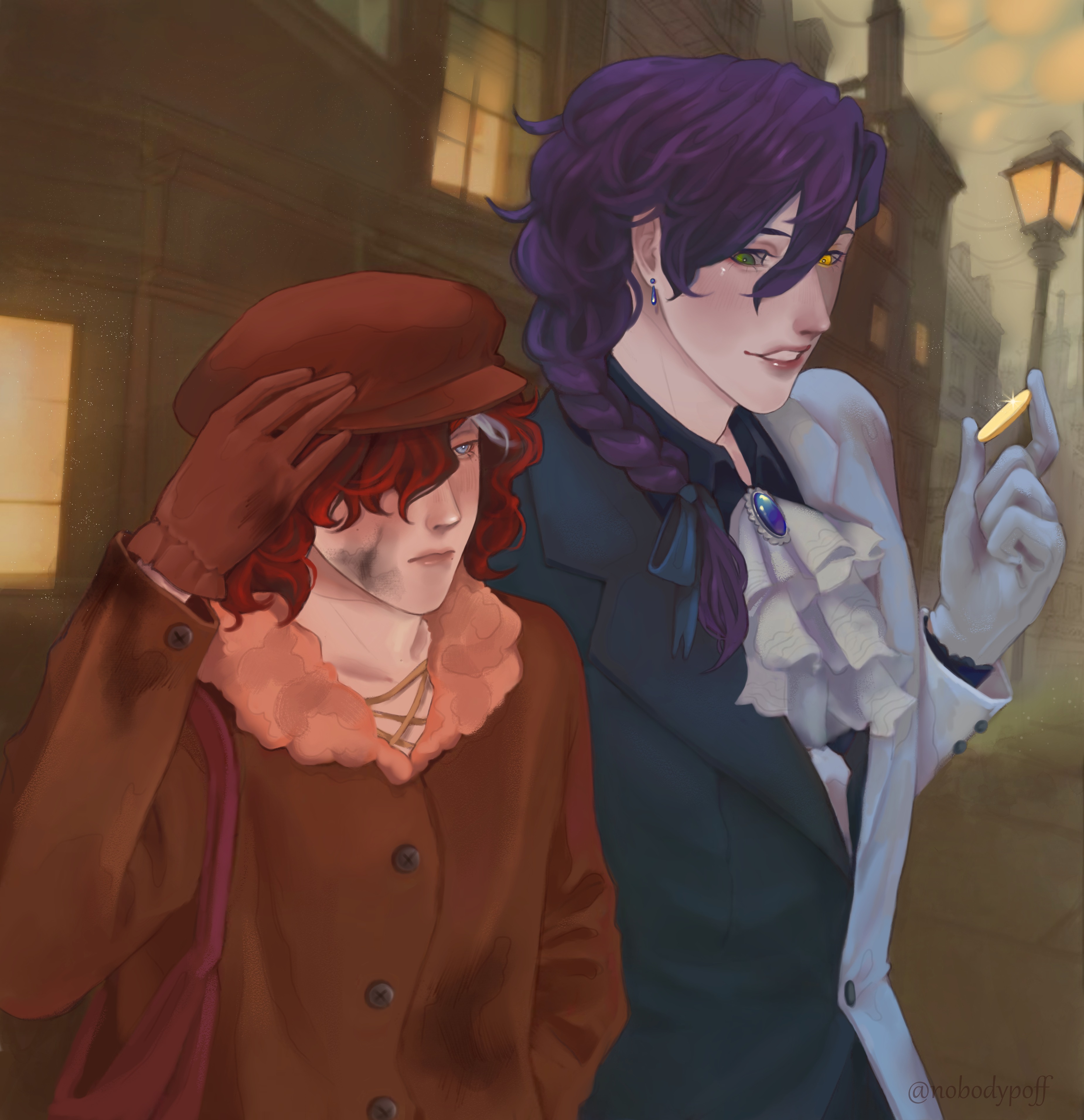 Да уж....живот так и остался пуст... Не зря купил пачку. Хоть покурю настоящий табак, а не помесь смолы, и какой-то гадости. Сквозняки и блуждающий ветер по улицам в разы сильнее, отчего челка неприятно взлетает ввысь или лезет в рот. Зажечь спичку стало целым испытанием, я чуть ли не сгорбился над ней, чтобы подпалить край кофейного свертка раза с пятого. Пропуская в легкие тугой дым, он пришелся мне головокружительной усладой, расслабляя плечи и унося заботы куда-то в каменный потолок. Узоры плавно кружились в воздухе, рисуя силуэты в богатом воображении. То дикие зайцы на опушках, то просторы тихих озер, звезд и много чего другого, что способен представить себе мозг. В этом есть что-то эстетичное, это я уже давно понял. Как же я утомился, убил весь день зазря, чтобы добраться до желанного и так легко профукать. А ведь еще идти пешком...И тут, сказочные видения тлеющей сигары унесло вдаль очередным дуновением. Но в сей раз оно было мимолетным и точно не из глубин переулков. Я повернулся в сторону, там стояла высокая фигура, дёргающая дверную рукоять в попытках открыть путь внутрь. Не люблю заострять внимание на одежде, но она... Довольно чудна. Чёрно-белый пиджак, бедные слуги или дамы в прачечных такое отстирывать. Вычурная синяя рубашка с узорным жабо и блестящей брошью, полосатые брюки. А вместо привычного хвоста на затылке, аккуратная коса сбоку, открывающая обзор на серьгу-каплю. Я невольно потрогал своë ухо с импровизированной бижутерией в виде маленького гвоздя, а опомнившись, тут же сунул ладонь в карман, докуривая остатки.
