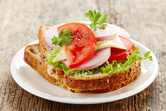 Сэндвич с колбасой сыром и помидором