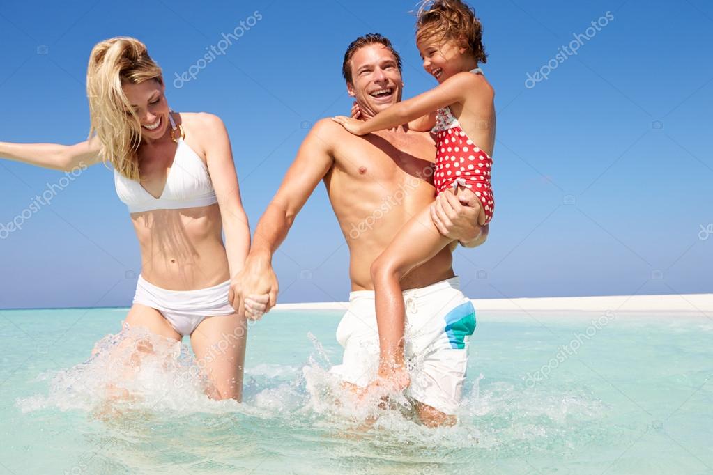 Белобрысый дядя на пляже резвится с молоденькой девочкой.