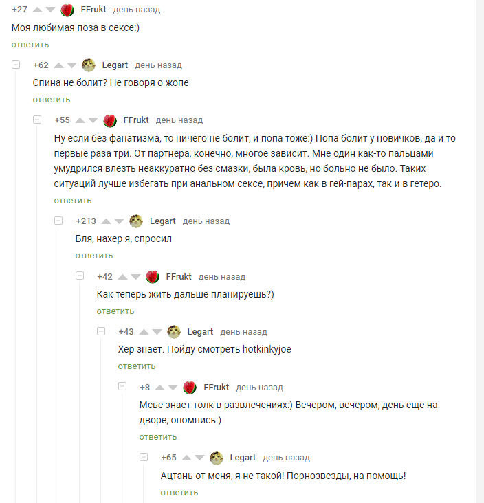 Секс и война . Дело том, что живу я этажом ниже, и мне до боли интересно, что же вы двигаете каждую, блин, ночь . у меня такая же проблема, . . . стала жаловаться что болит пися и попа, . . .