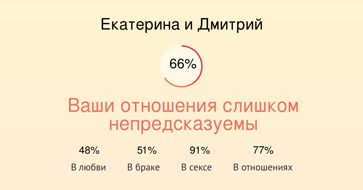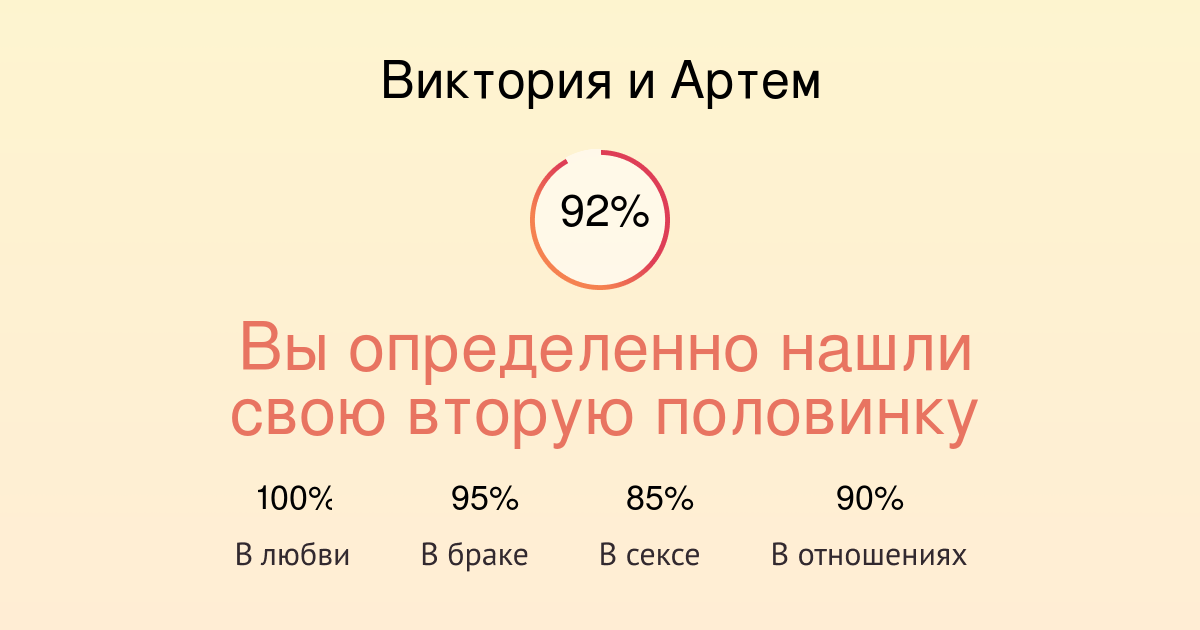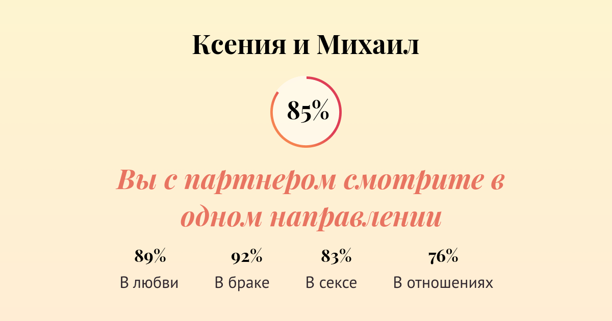 Совместимость имён позволяет узнать, насколько два партнёра подходят друг другу в семейных отношениях, в дружбе или в отношениях трудового сотрудничества . Замужество . Совместимость мужчины и женщины в любви и браке показывает, насколько ваш союз будет . . .