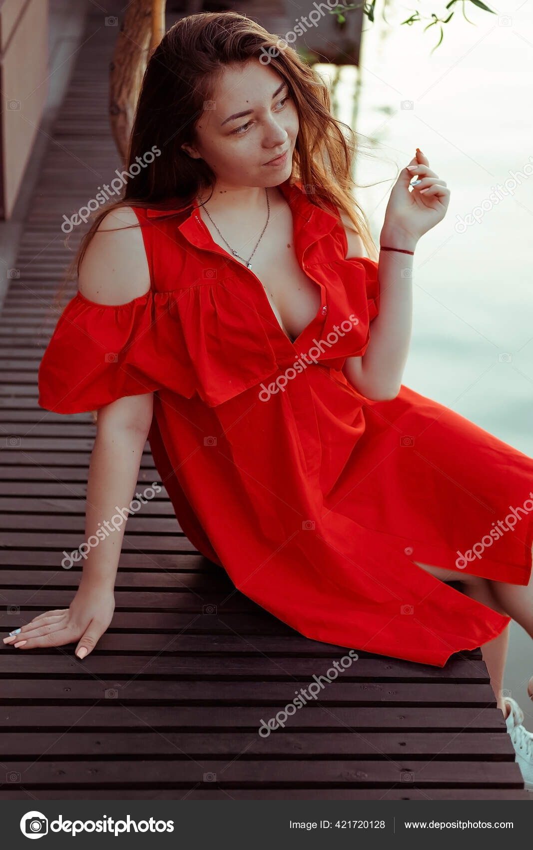 фото около Сексуальная молодая дама в порхая красном платье и длинных волосах . изображение насчитывающей платье, красном, молодая - 48677617