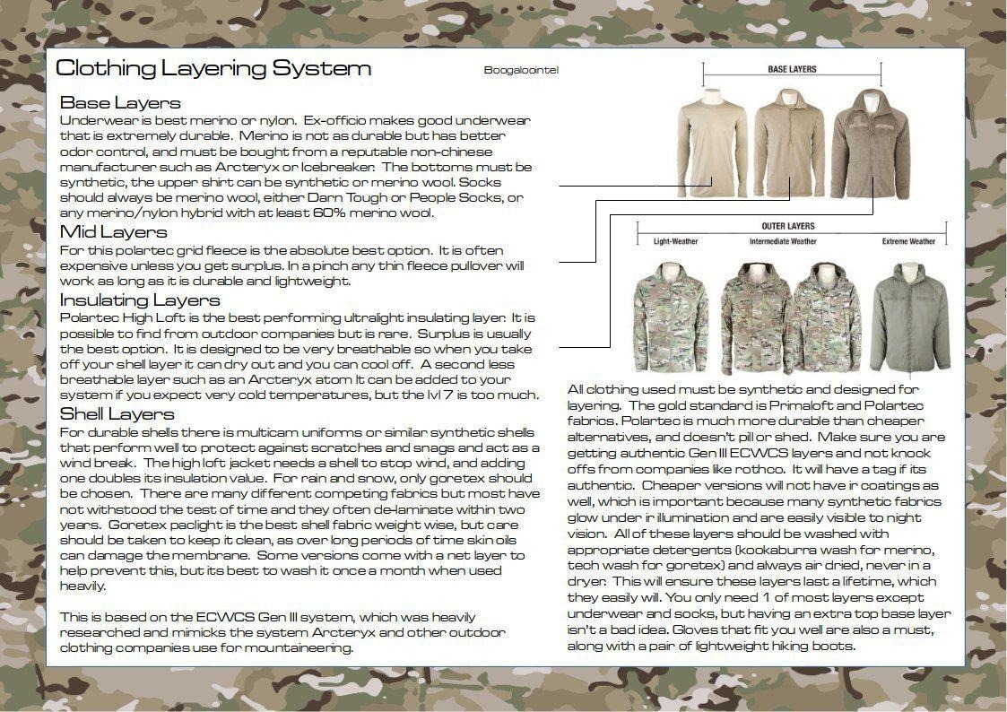 If possible, NIR compliant uniforms should be acquired. NIR compliant material is specially treated to reduce the reflection of Infrared light, which means it will blend into its surroundings better when under the gaze of Night Vision Goggles or other NIR devices.
