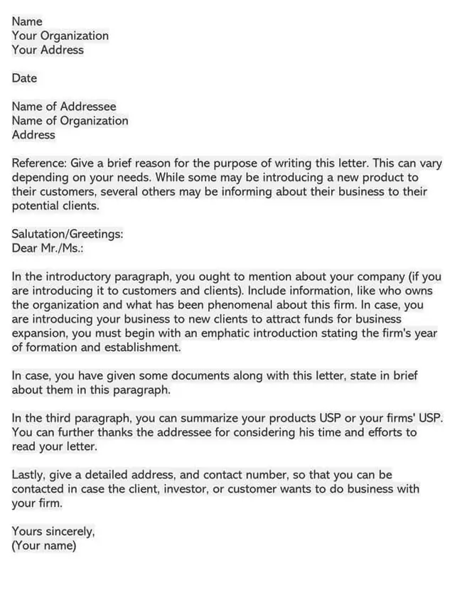 Use our free Self-Introduction Letter to help you get started . Simply download the .doc or pdf file and customize it . If you need additional help or more examples check out some of the sample letters below . From, _____________ ( Name of sender & company's address) _____________ . _____________ . Date__________ . To,