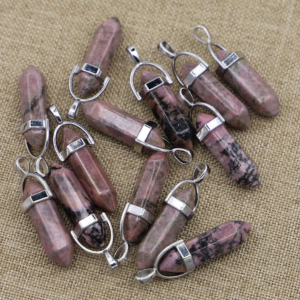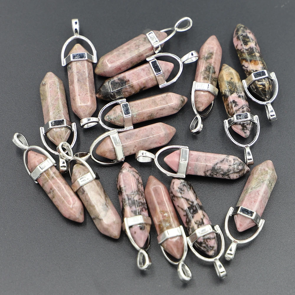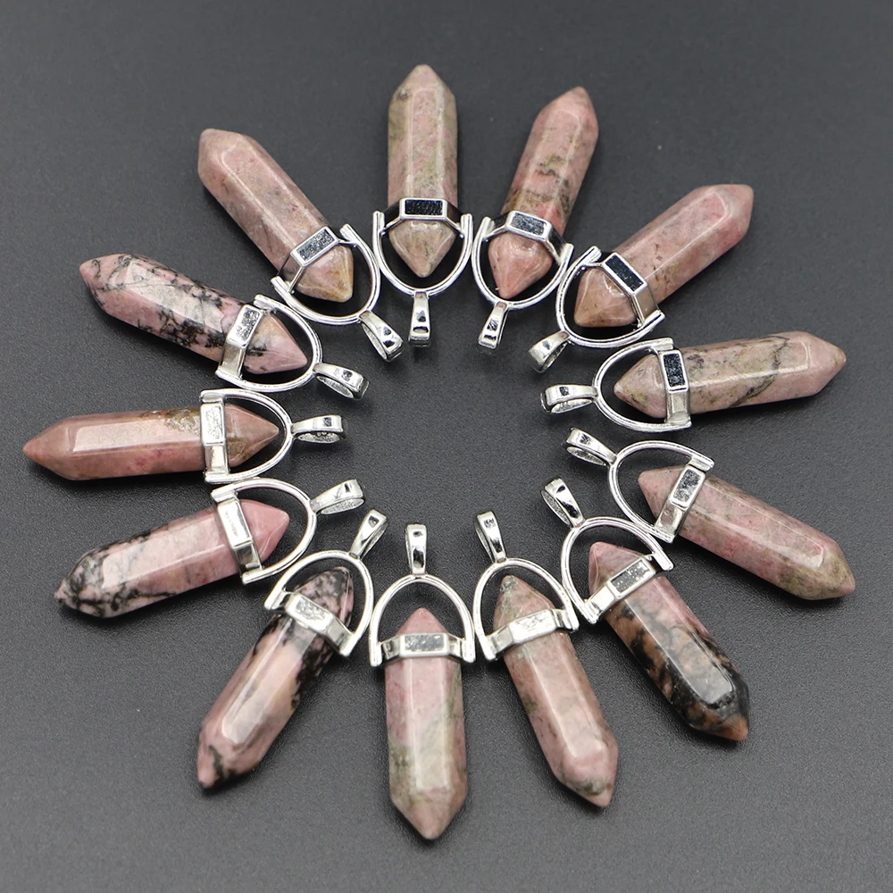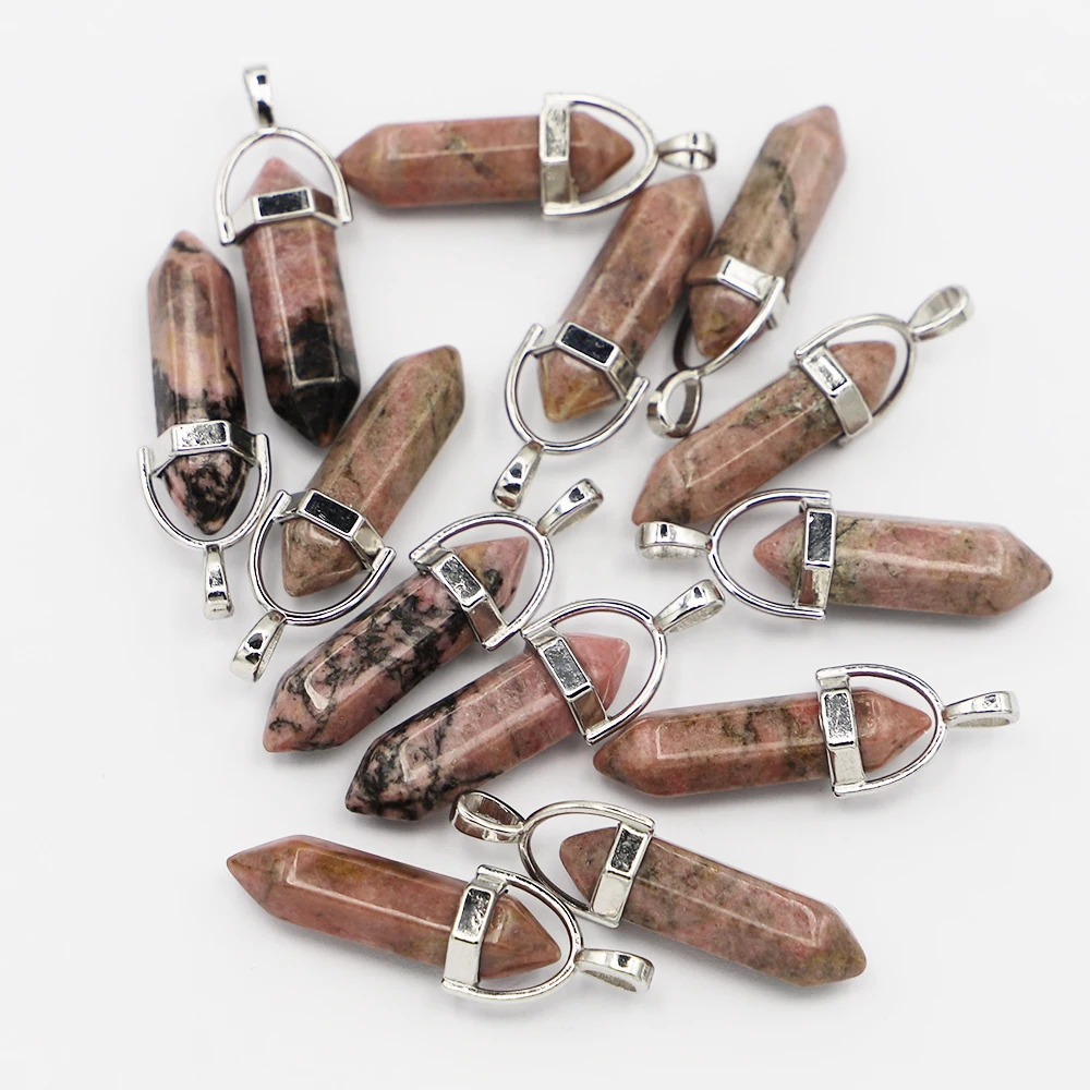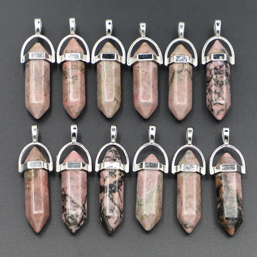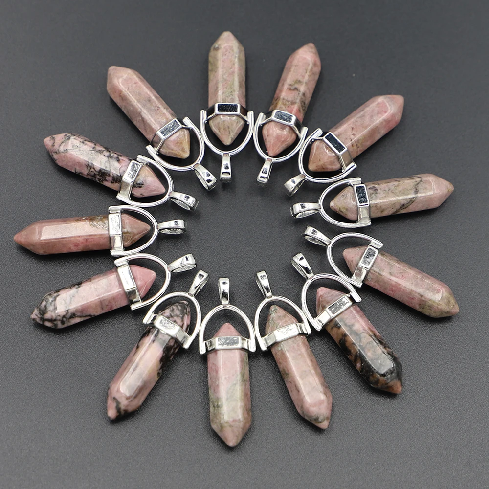 Selling Natural Stone Rhodonite Hexagonal Column Pillar Point Fashion Pendant Charm Quartz Crystal Necklace Jewelry Making 25Pcs - Купить с бесплатной доставкой