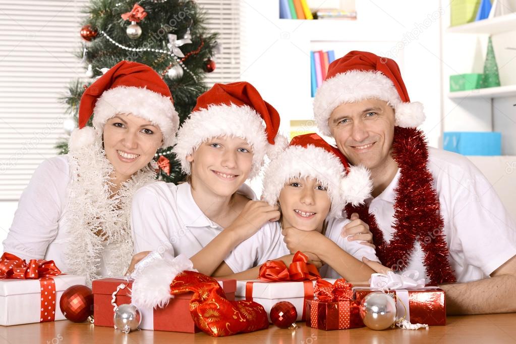 Счастливая семья празднует Новый год и Рождество — Стоковые фото, картинки в хорошем качестве Скачайте это изображение,
