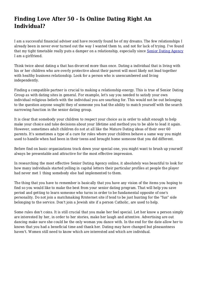 Meet Singles Over 50 Near You . Welcome to The Senior Dating Agency . One of Ireland's leading dating sites for singles over 50 . Whatever type of relationship you are looking for, be it companionship, friendship, activity partners or a long term relationship we can help . It's quick, easy and free to join The Senior Dating Agency .