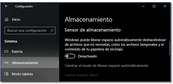 Sensor de almacenamiento (Storage Sense) en Windows 10