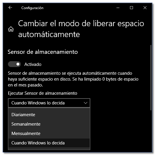 Para realizar la función de Sensor de almacenamiento (Storage Sense), se debe habilitar tal función y configurar el periodo en que se realice.