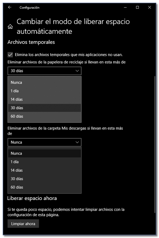 En la misma ventana se dispone de la opción de Liberar espacio automáticamente, pudiendo seleccionar el periodo en que se realice. También se dispone la opción de configurar el periodo de permanencia del contenido en el directorio Descargas.