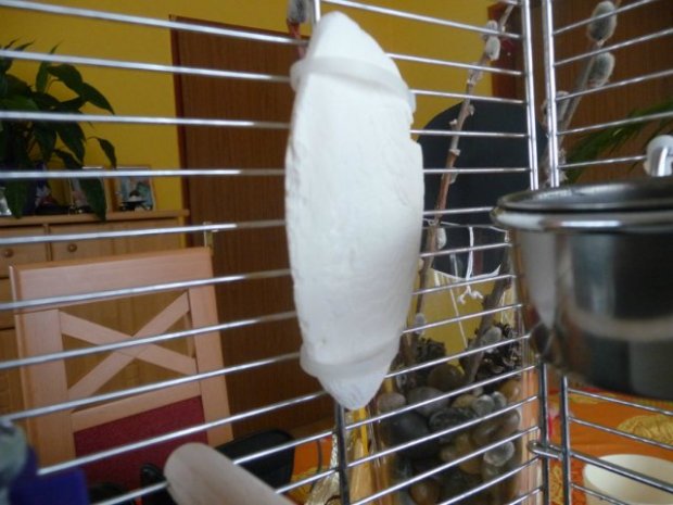 В клетке всегда должна быть минеральная подкормка - сепия (часть скелета каракатицы), минеральный камень, они нужны попугаю для заточки клюва и пополнения минеральных веществ . Сепия Сепия бывает разных цветов, цвет зависит от добавок, я рекомендую брать белую сепию - 100% натуральный продукт без добавок .
