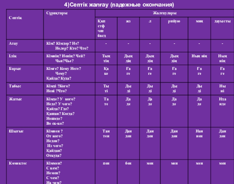 Септік жалғау таблица