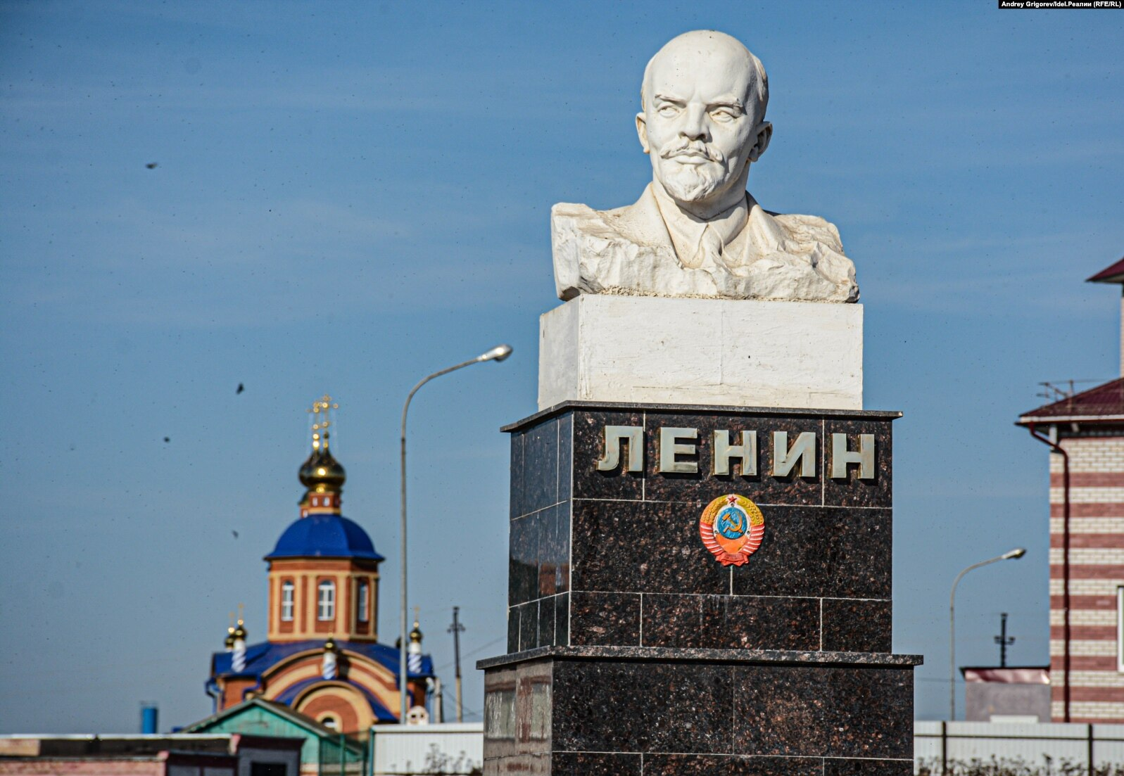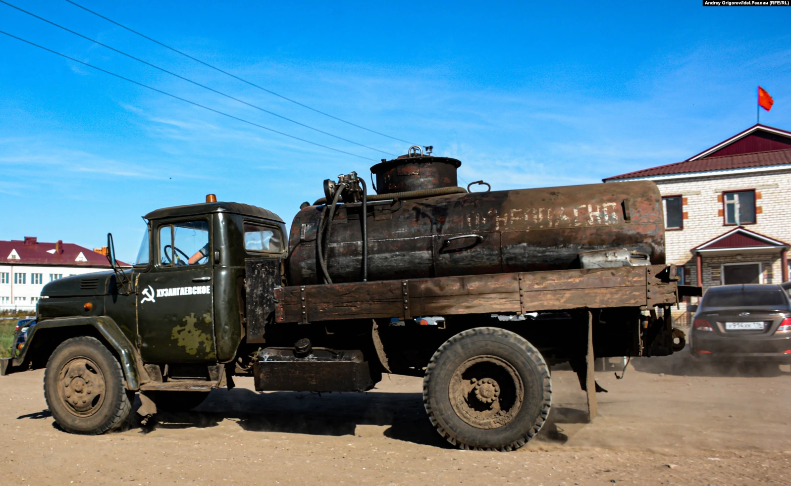 На фоне церкви Ильич лукаво щурится (саму церковь, правда, на момент моего приезда не сносили, а наоборот пытались отстроить); над хозяйственными постройками развеваются красные флаги, некоторые натурально — как после обстрела; на технике — особенно самой ржавой и допотопной — трафаретные серп с молотом… В общем, сразу вспомнишь унылые советское детство, состоявшее сплошь из таких вот проржавевших символов — и поневоле пустишь скупую мужскую слезу.