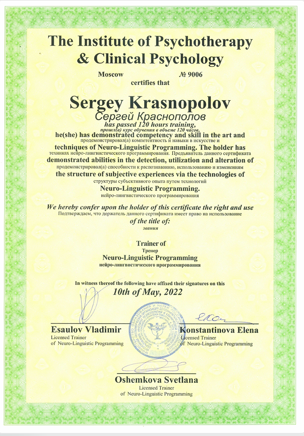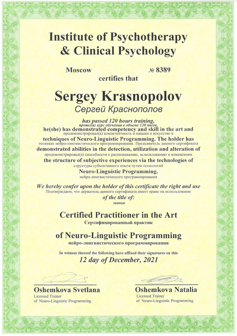 Практический психолог, НЛП-тренер, гипнотерапевт, бизнес-тренер.