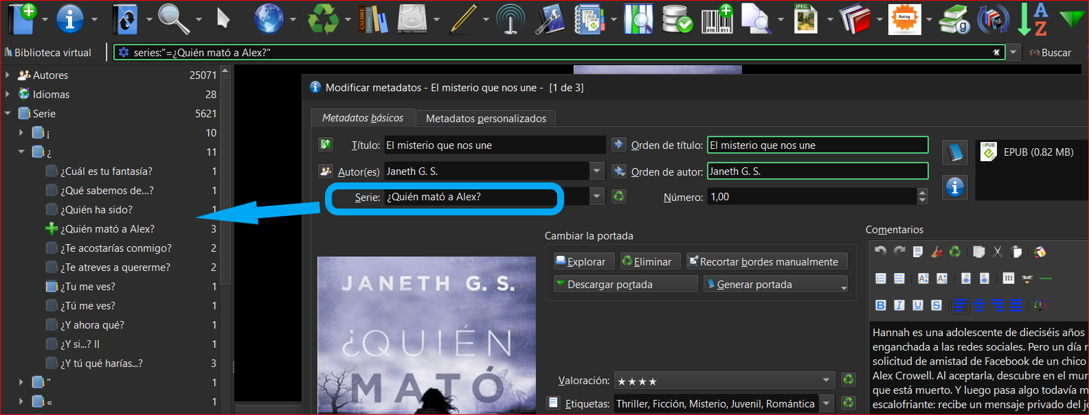 En la ventana central nos muestra donde debemos poner el nombre de la Serie y al costado izquierdo donde se van organizando.