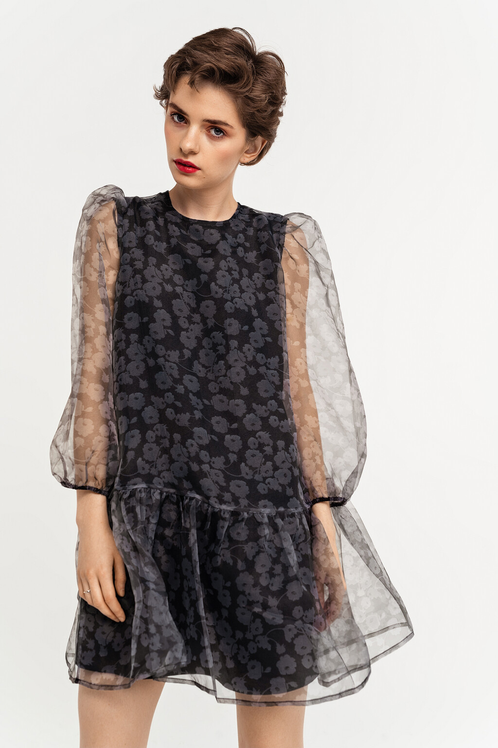 Серое платье-трапеция с цветочным принтом | Платья де…