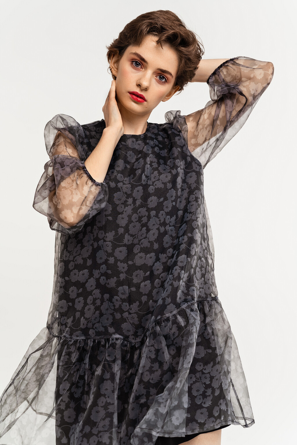 Серое платье-трапеция с рюшами и воланом Характеристики ...