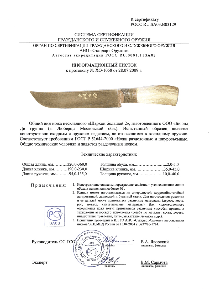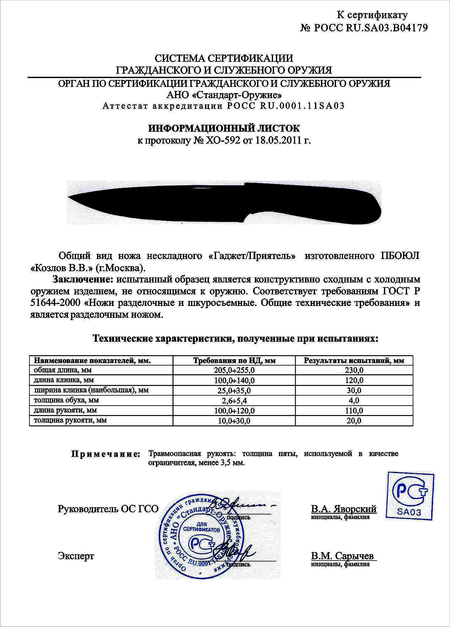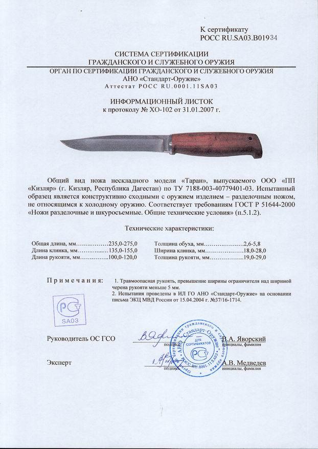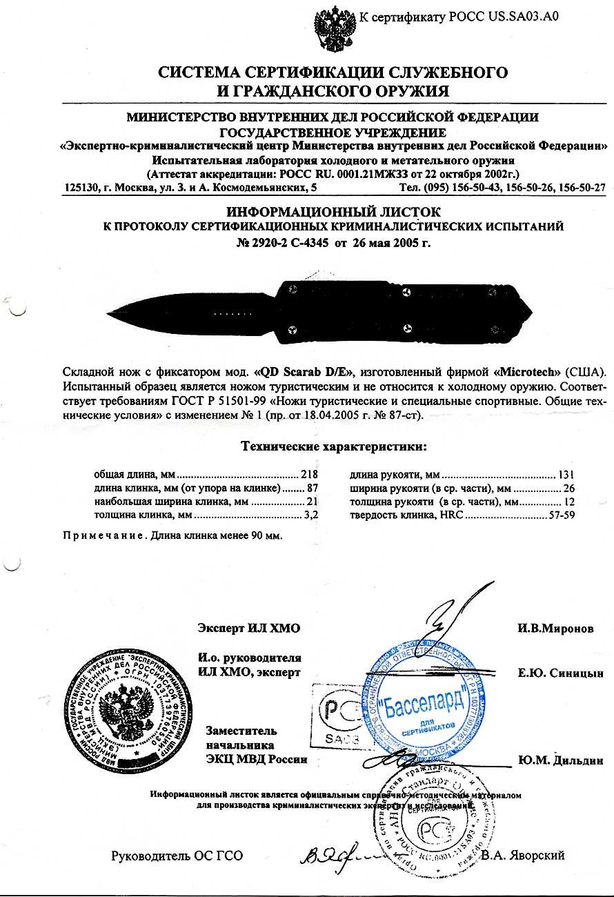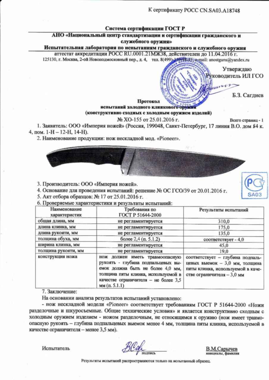 Сертификат что нож не является холодным