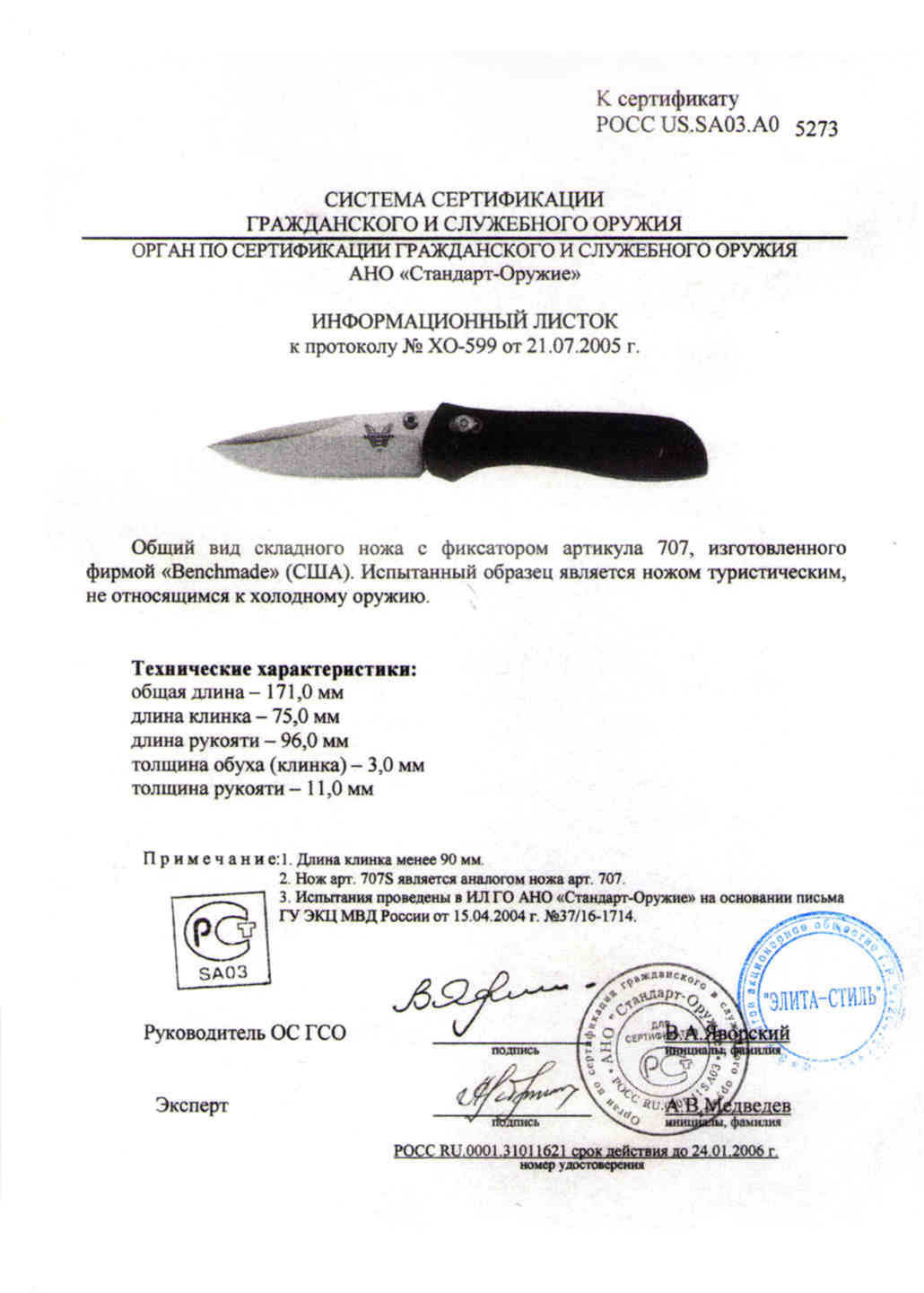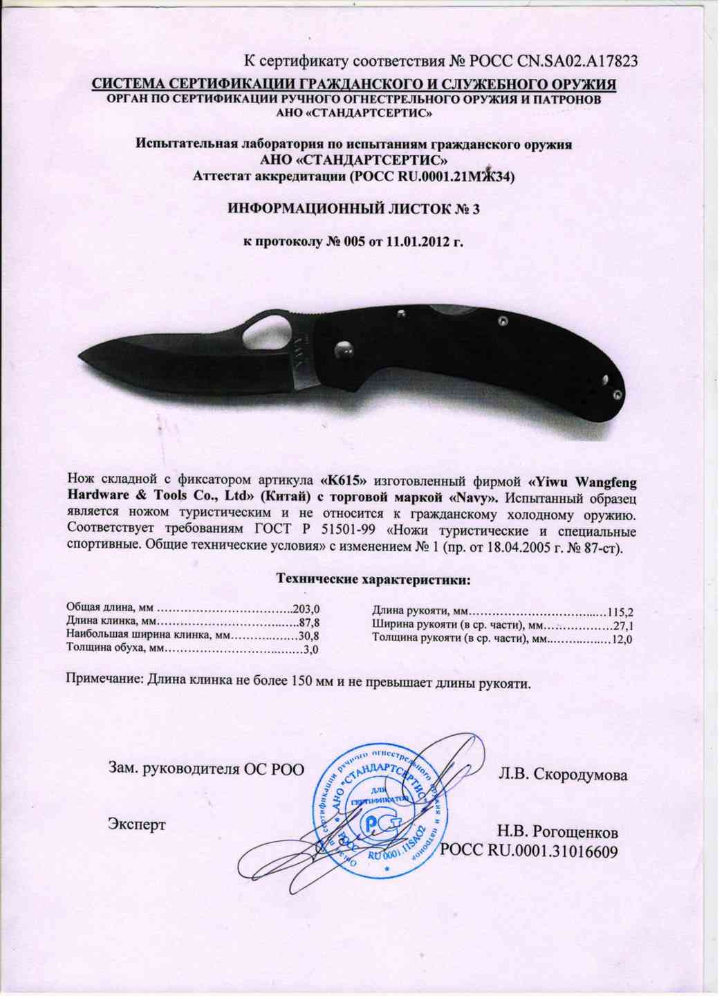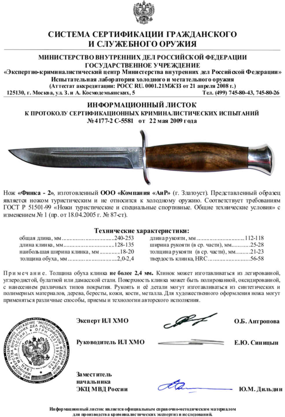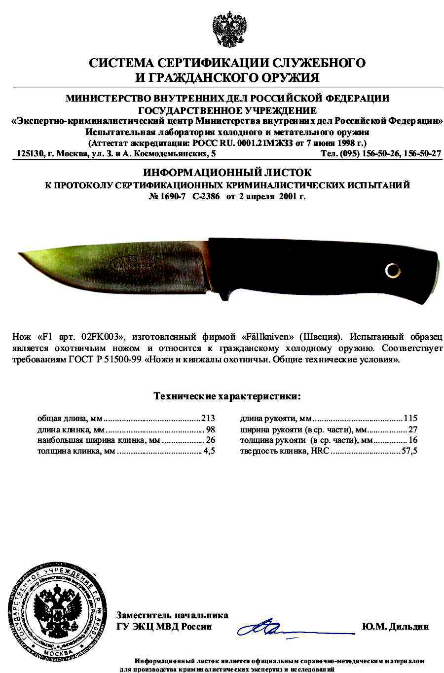 Сертификат что нож не является холодным