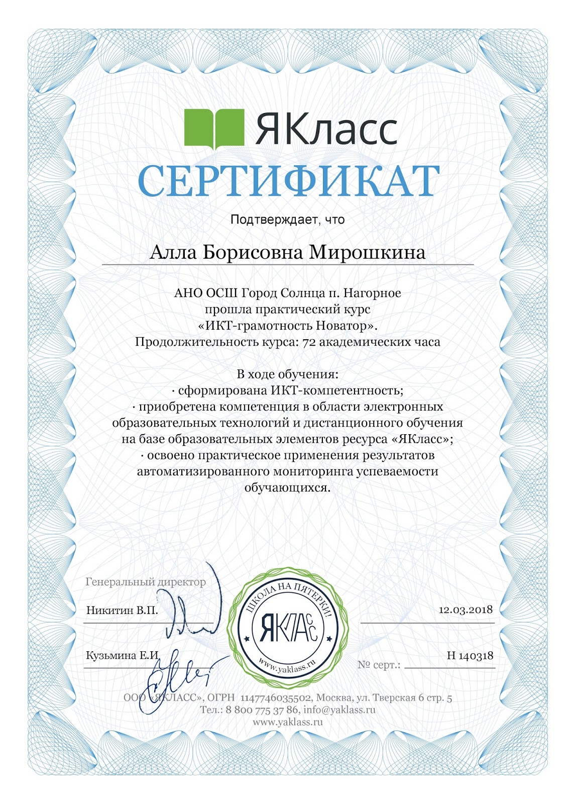 Сертификат прохождении класса