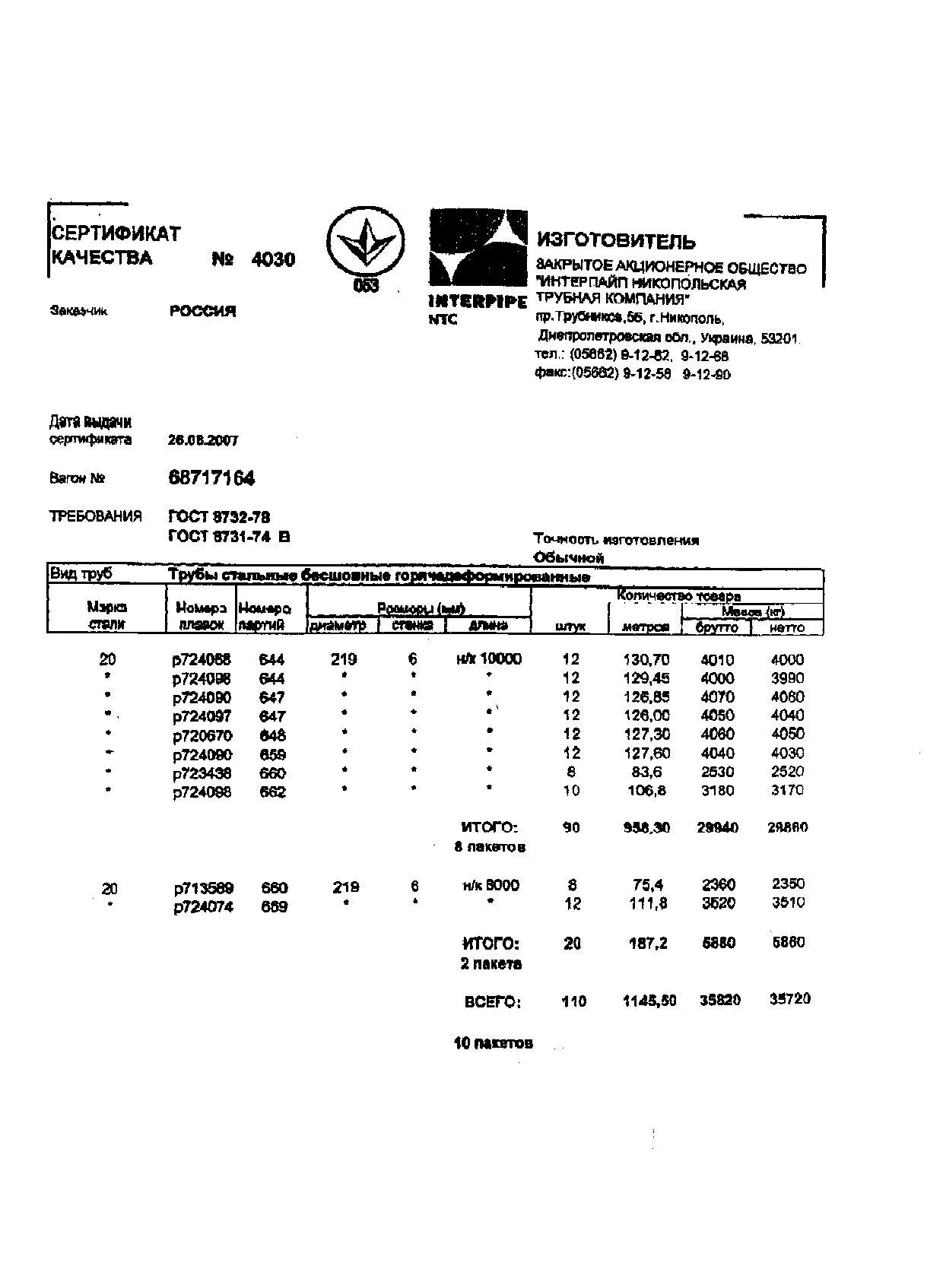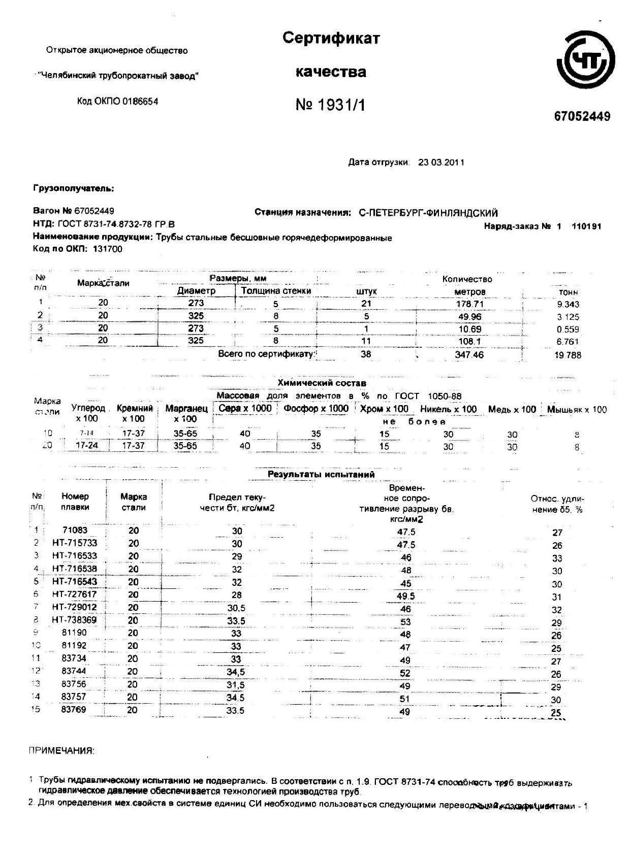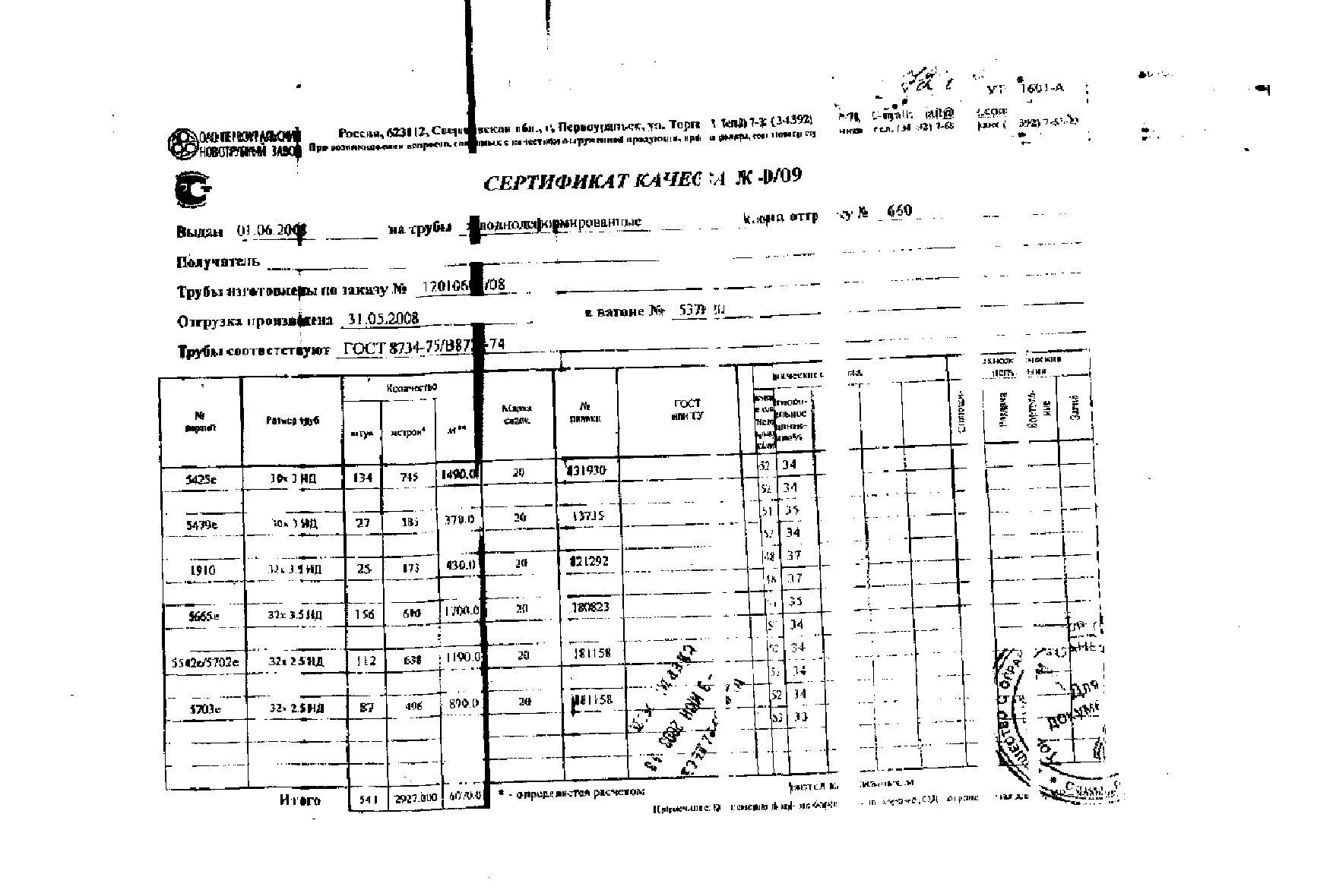 Сертификат труба 8734 75