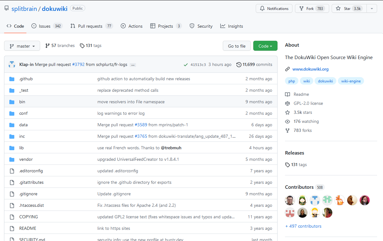 Находим репозиторий DocuWiki на Github – https://github.com/splitbrain/dokuwiki.