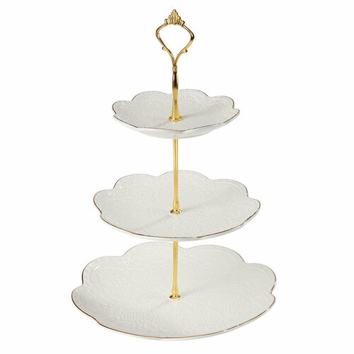 "Elegance" servis rafı, masanız için gerçek bir dekorasyona dönüşecek lüks ve zarif bir servis elemanıdır. Yüksek kaliteli fildişi porselenden yapılmış olup, altınla kaplanmış çelik bir tabana sahiptir ve ona özel bir sofistike dokunuş katar. Rafın yüksekliği 37 cm ve çapı 26 cm olup, üzerine oldukça fazla sayıda ikram yerleştirmenize olanak sağlar. Tatil masanızda tatlılar, meyveler, peynirler veya kanepeler servis etmek için idealdir.