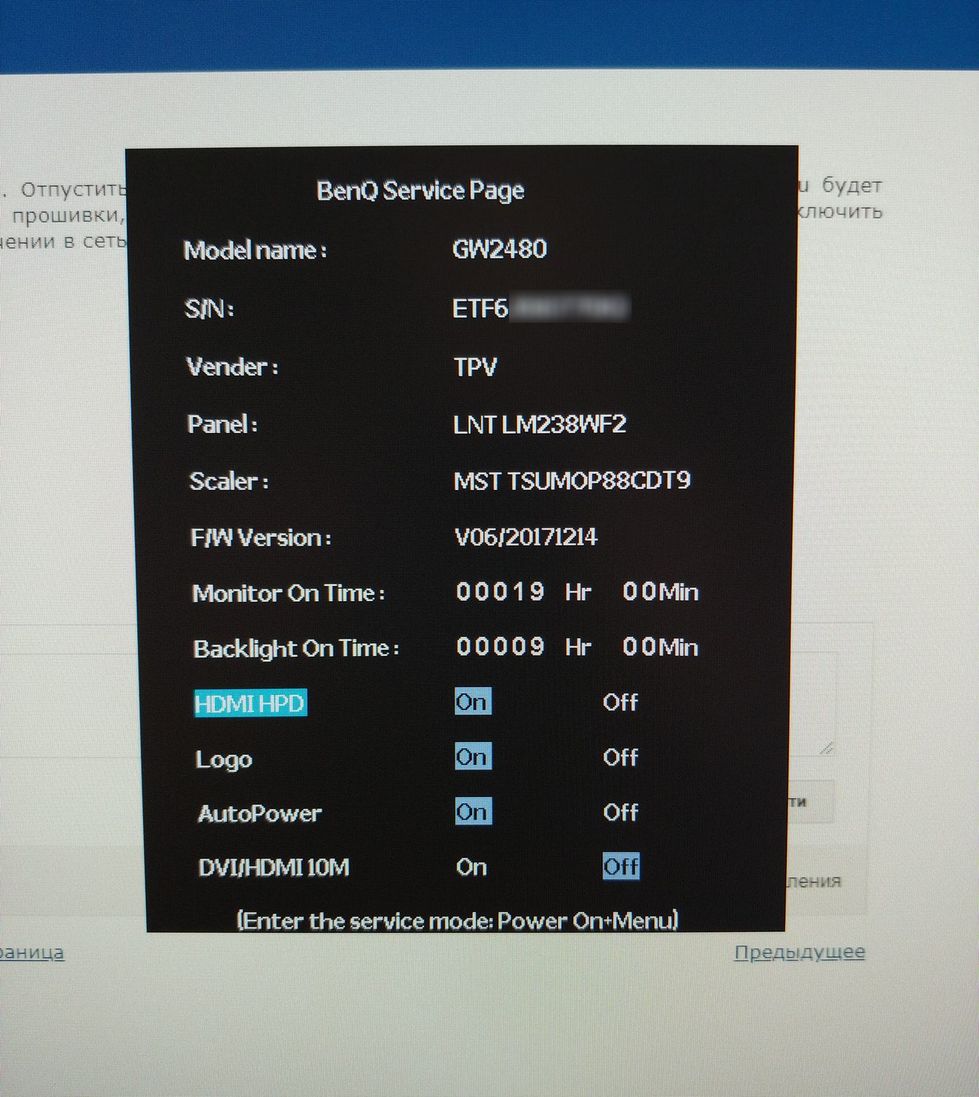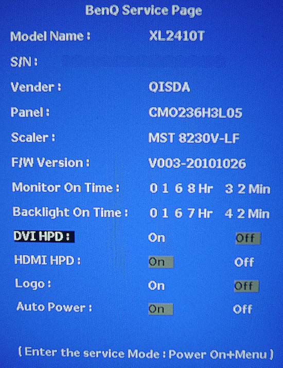 BenQ G2420HD, сервисное меню . Чтобы зайти в сервисное меню нужно при включении монитора нажать кнопку Menu . Отпустить и теперь до выключения монитора при нажатии на Menu будет появляться именно сервисное . В нем отражена информация о производстве, версия прошивки, время . . .
