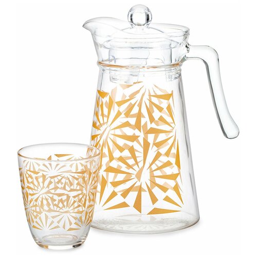 Service à boire Luminarc Sofia (Sofia). 7 articles pour 6 personnes. Contenu : Pichet avec couvercle 1,3 l - 1 pc. Verres hauts 310 ml - 6 pcs. Matériau : verre résistant aux chocs. Matériau du couvercle : plastique. Peut être lavé au lave-vaisselle et utilisé au micro-ondes. L'ensemble à boire est fabriqué en verre trempé transparent avec un motif doré qui est solidement appliqué et ne se lave pas au lave-vaisselle même après de nombreux cycles de lavage. Le couvercle en plastique protège le contenu de la poussière et des insectes. Les verres larges et bas conviennent non seulement pour l'eau et les jus de fruits, mais aussi pour les boissons glacées et même les desserts.