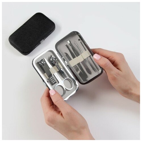 Set de manucure « Textura », 8 articles, noir. Dans le set, pcs. : 8. Type d'emballage : Caisse. Enfants : Non. Pour qui : Pour les femmes. Taille : 11 cm x 7 cm x 2 cm. Taille de l'emballage : 11 cm x 7 cm x 2 cm. Composants de l'ensemble : grattoir, couteau, tondeuse, aiguille de cosmétologie, lime, ciseaux, pince à épiler. Pays d'origine : Chine. Thème des fêtes : Universel. Couleur noire. ---.(5198969)