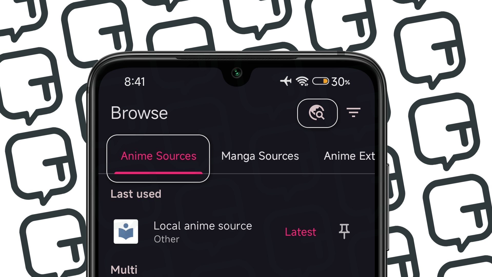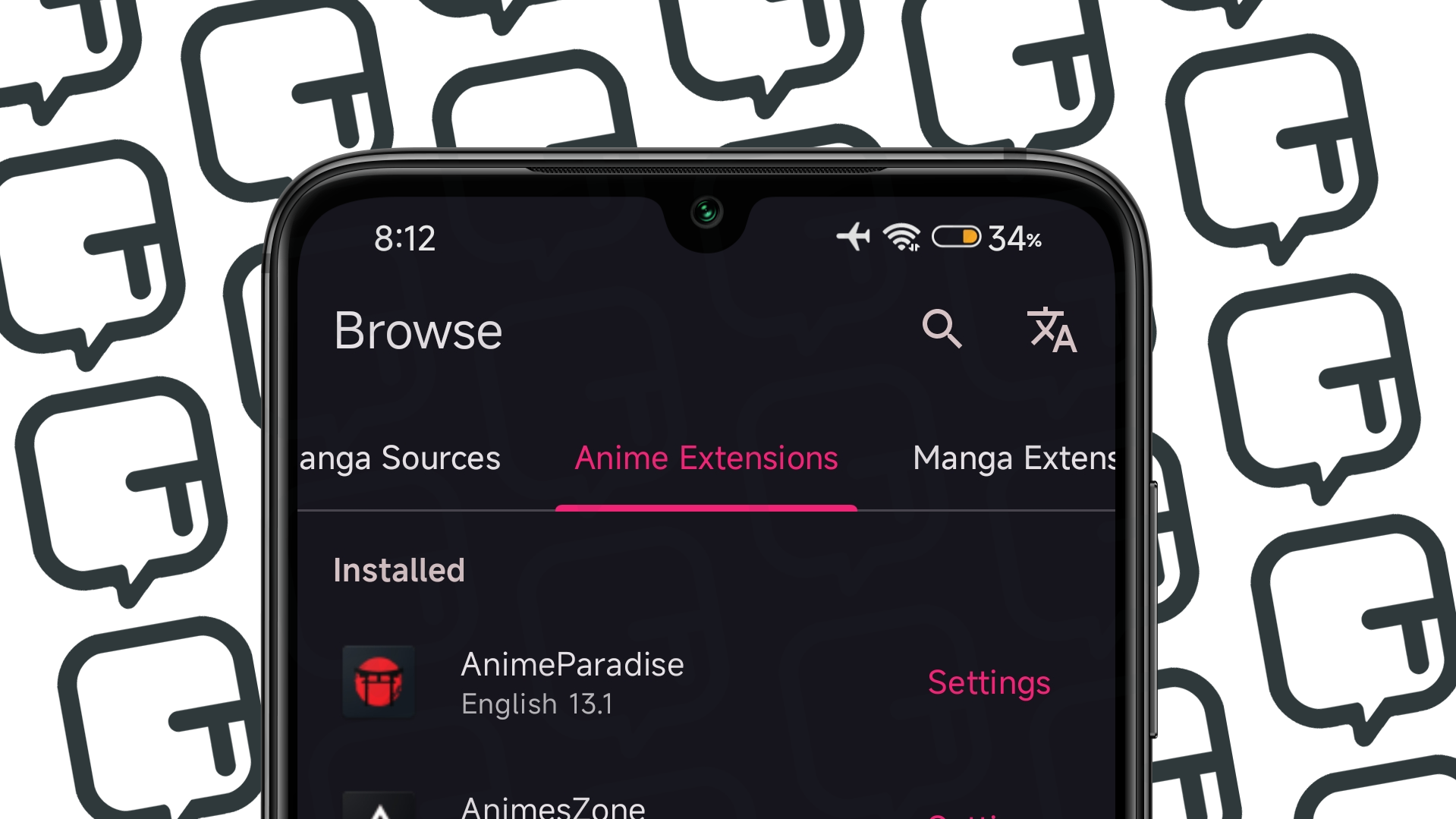 #2 - In the "Browser" tab, go to the first section "Anime Sources," where you'll see an icon of a magnifying glass and a planet. That's it. Click on the icon and search for the anime you want. Remember to mark the anime you searched for as a favorite (if you wish); this way, it will be highlighted in the "Animes" tab, making your search easier. If you want to look for manga, it's the same process, but go to the "Manga Sources" section.