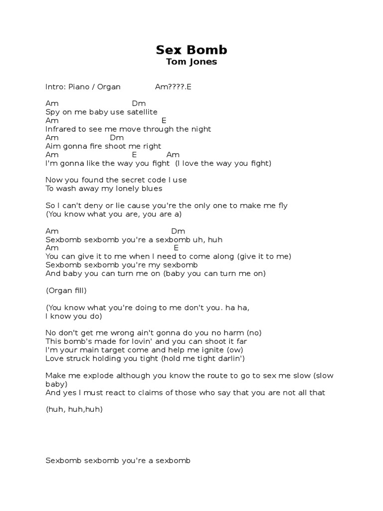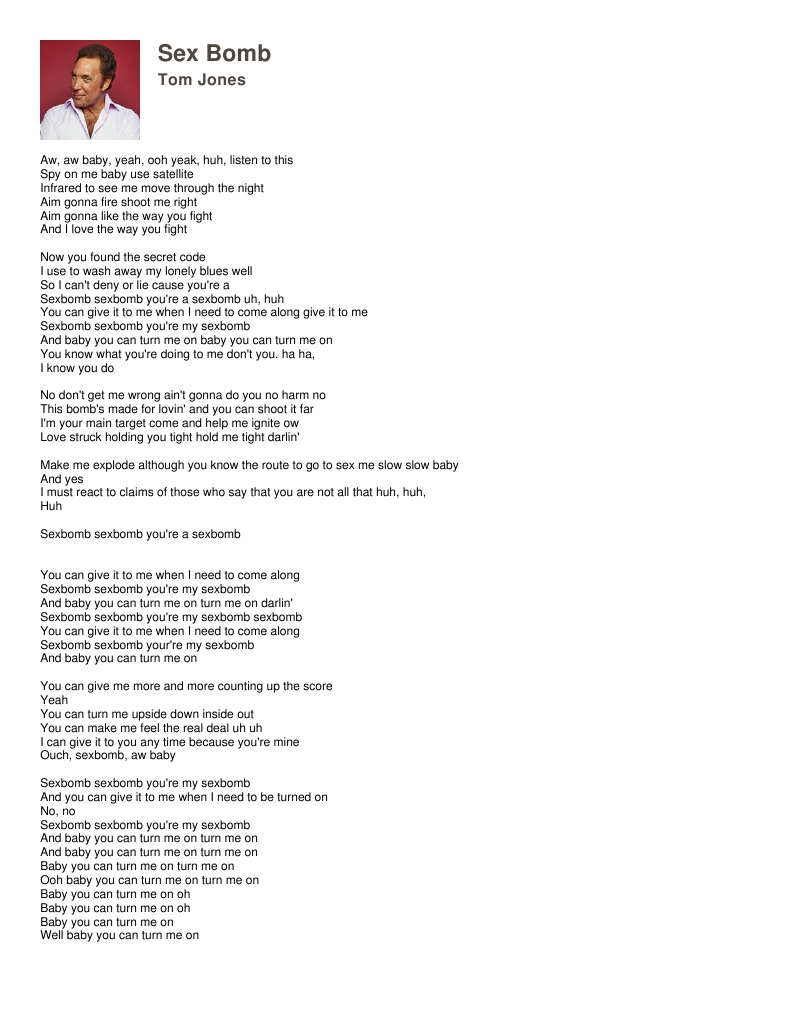 Перевести · Sex bomb, sex bomb (Well) You're my sex bomb You can give it to me when I need to come along Sex bomb, sex bomb (Yeah) You're my sex bomb (Oh!) And baby you can turn me on. (Turn me on darlin'!) Sex bomb, sex bomb (Haha) You're my sex bomb (Sex bomb!) You can give it to me when I need to come along Sex bomb, sex bomb You're my sex bomb …