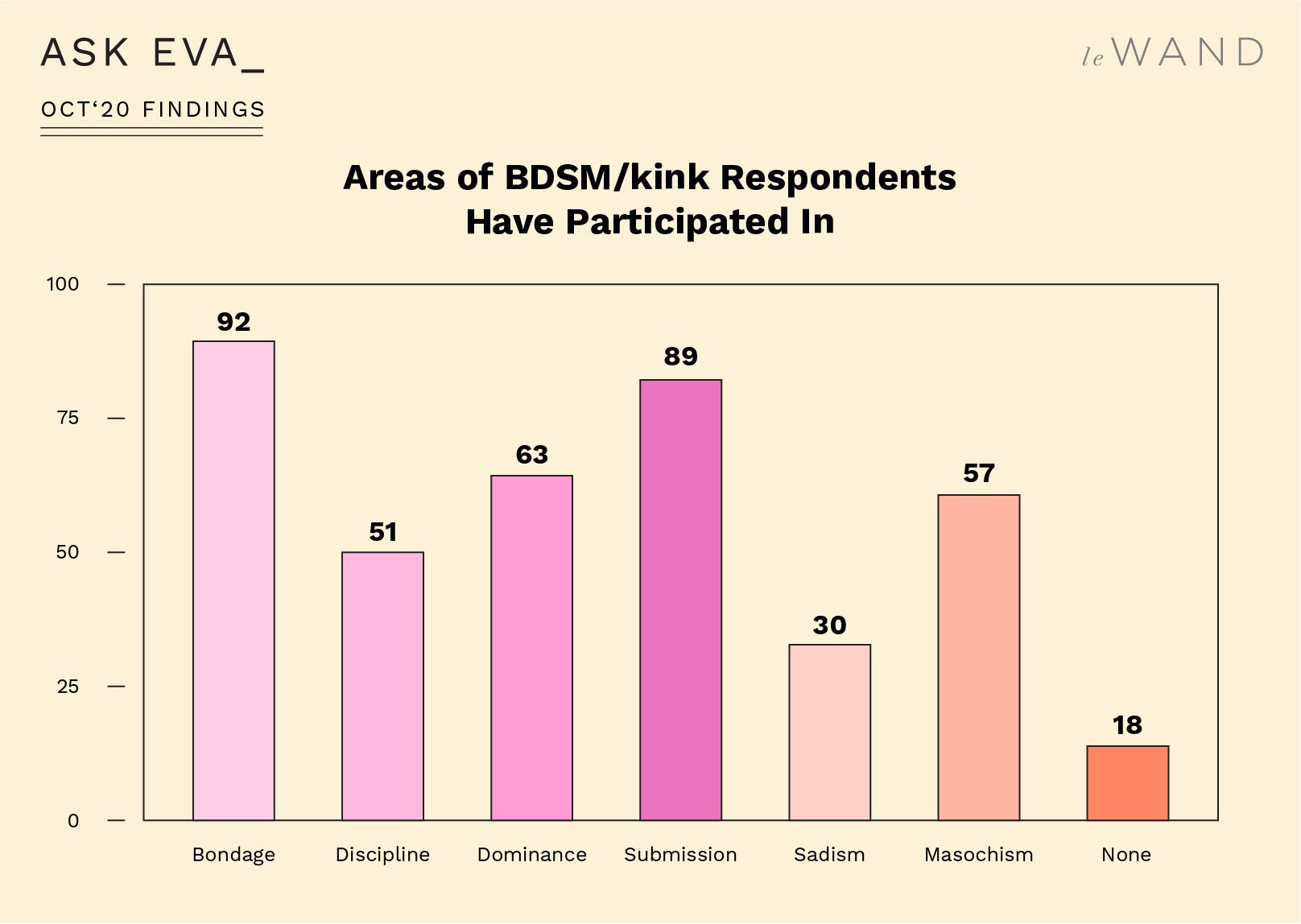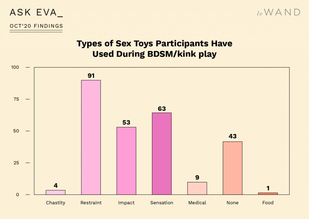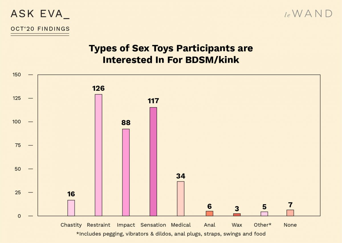 Everybody surveyed, regardless of gender identity, were interested in trying new sexual positions, and the whole group agreed that non-missionary positions aren’t really “taboo” anymore. Non-missionary and light bondage, meaning slightly controlling your partner’s mobility during sex, were the only acts that men and women agreed on wanting to try. However, when asked whether they’d like to get gently tied up or tie their partner up, most men and women answered, “Tie me up, please.” That means we have a surplus of submissives walking around, and perhaps not enough dominants in the world to satisfy them.